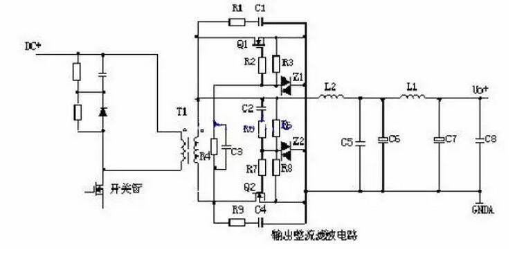的相位相反。D1為整流二極管,R1、C1為削尖峰電路。L1為續(xù)流電感,R2為假負載,C4、L2、C5組成π型濾波器。3、同步整流電路:
