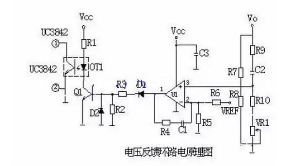 2、工作原理:當輸出U0升高,經(jīng)取樣電阻R7、R8、R10、VR1分壓后,U1③腳電壓升高,當其超過U1②腳基準電壓后U1①腳輸出高電平,使Q1導通,光耦OT1發(fā)光二極管發(fā)光,光電三極管導通,UC3842①腳電位相應變低,從而改變U1⑥腳輸出占空比減小,U0降低。