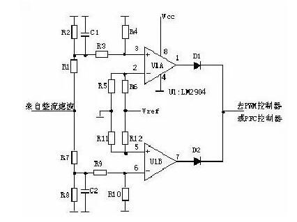 2、工作原理:AC輸入和DC輸入的開(kāi)關(guān)電源的輸入過(guò)欠壓保護(hù)原理大致相同。保護(hù)電路的取樣電壓均來(lái)自輸入濾波后的電壓。取樣電壓分為兩路,一路經(jīng)R1、R2、R3、R4分壓后輸入比較器3腳,如取樣電壓高于2腳基準(zhǔn)電壓,比較器1腳輸出高電平去控制主控制器使其關(guān)斷,電源無(wú)輸出。另一路經(jīng)R7、R8、R9、R10分壓后輸入比較器6腳,如取樣電壓低于5腳基準(zhǔn)電壓,比較器7腳輸出高電平去控制主控制器使其關(guān)斷,電源無(wú)輸出。