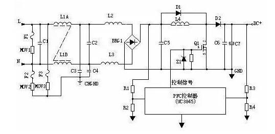 2、工作原理:輸入電壓經(jīng)L1、L2、L3等組成的EMI濾波器,BRG1整流一路送PFC電感,另一路經(jīng)R1、R2分壓后送入PFC控制器作為輸入電壓的取樣,用以調(diào)整控制信號(hào)的占空比,即改變Q1的導(dǎo)通和關(guān)斷時(shí)間,穩(wěn)定PFC輸出電壓。L4是PFC電感,它在Q1導(dǎo)通時(shí)儲(chǔ)存能量,在Q1關(guān)斷時(shí)施放能量。D1是啟動(dòng)二極管。D2是PFC整流二極管,C6、C7濾波。PFC電壓一路送后級(jí)電路,另一路經(jīng)R3、R4分壓后送入PFC控制器作為PFC輸出電壓的取樣,用以調(diào)整控制信號(hào)的占空比,穩(wěn)定PFC輸出電壓。
