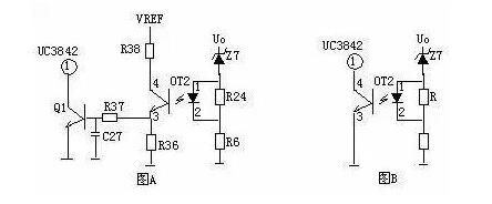 圖A的工作原理是,當(dāng)輸出電壓Uo升高,穩(wěn)壓管導(dǎo)通,光耦導(dǎo)通,Q2基極得電導(dǎo)通,由于Q2的導(dǎo)通Q1基極電壓降低也導(dǎo)通,Vcc電壓經(jīng)R1、Q1、R2使Q2始終導(dǎo)通,UC3842③腳始終是高電平而停止工作。在圖B中,UO升高U1③腳電壓升高,①腳輸出高電平,由于D1、R1的存在,U1①腳始終輸出高電平Q1始終導(dǎo)通,UC3842①腳始終是低電平而停止工作。正反饋?