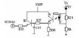 輸出限壓保護(hù)電路如下圖,當(dāng)輸出電壓升高,穩(wěn)壓管導(dǎo)通光耦導(dǎo)通,Q1基極有驅(qū)動(dòng)電壓而道通,UC3842③電壓升高,輸出降低,穩(wěn)壓管不導(dǎo)通,UC3842③電壓降低,輸出電壓升高。周而復(fù)始,輸出電壓將穩(wěn)定在一范圍內(nèi)(取決于穩(wěn)壓管的穩(wěn)壓值)。