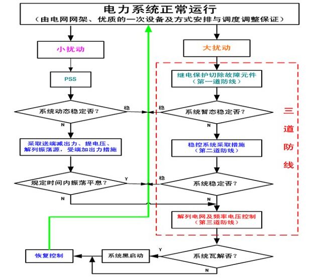 穩(wěn)定控制系統(tǒng)是基于對電網(wǎng)的穩(wěn)定分析而配置的,它只針對預(yù)想的運(yùn)行方式、預(yù)定的故障類型,如果出現(xiàn)了預(yù)想以外的方式或故障,則穩(wěn)控系統(tǒng)不能保證電網(wǎng)的穩(wěn)定性,即第二道防線是人們主動(dòng)出擊采取的措施;
