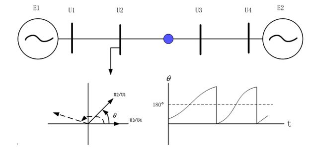 至于失步解列判據(jù),相對比較理論,而且很多方法無法統(tǒng)一,一般采用振蕩中心兩側(cè)母線電壓相量直接比相原理,當兩側(cè)母線電壓相位差軌跡超過180度時認為系統(tǒng)失去同步,且振蕩中心在兩個母線之間。