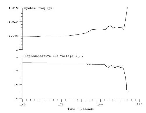 160s后,另外一些發(fā)電機由于OEL作用而使Qlimit致Qnominal,減少無功輸出,加大了和加速了電壓下降―――發(fā)電機失步,低壓保護而失去一些發(fā)電機。