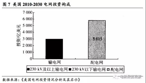 近年來(lái),美國(guó)電網(wǎng)投資年均440億美元,接近中國(guó)電網(wǎng)年均投資的一半。據(jù)《美國(guó)電網(wǎng)投資情況分析及其啟示》,2010-2030年的20年間,在美國(guó)電網(wǎng)建設(shè)投資中,配電網(wǎng)投資將達(dá)到5815億美元,接近輸電網(wǎng)投資額的兩倍,整體上看電網(wǎng)年均投資額為440億美元。