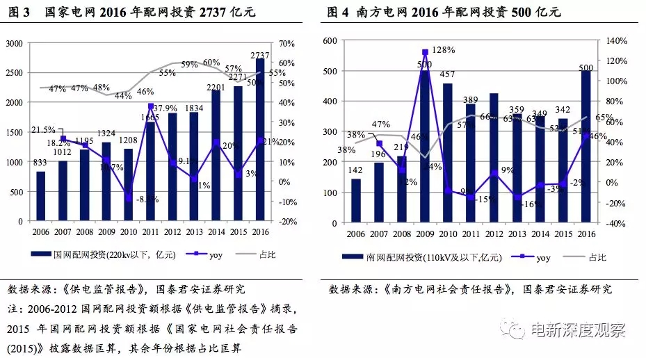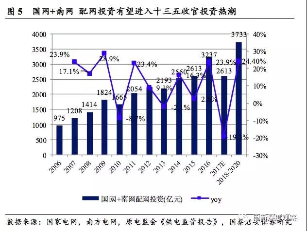 十三五時(shí)期考核的是配網(wǎng)“累計(jì)”投資,配網(wǎng)或?qū)⒊蔀槲覈?guó)電網(wǎng)投資中的結(jié)構(gòu)性機(jī)會(huì)。2015年7月31日,國(guó)家能源局下發(fā)《配電網(wǎng)建設(shè)改造行動(dòng)計(jì)劃(2015-2020)》,提出2015-2020年配電網(wǎng)建設(shè)改造投資不低于2萬(wàn)億元,其中,2015年投資不低于3000億元,2016-2020年累計(jì)投資不低于1.7萬(wàn)億元。因此行業(yè)通常有“年均配網(wǎng)投資3000億”的說(shuō)法,但實(shí)際上,《行動(dòng)計(jì)劃》只是提出2015年配網(wǎng)投資不低于3000億元,十三五時(shí)期的要求是累計(jì)投資而非年均投資。