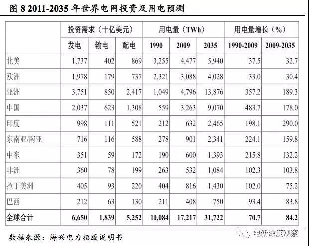 根據(jù)國(guó)際能源署《世界能源展望2011》統(tǒng)計(jì),到2035年,全球用電總量將達(dá)到317,220億千萬(wàn)時(shí),較2009年增長(zhǎng)84.2%。強(qiáng)勁的電力需求將拉動(dòng)全球電網(wǎng)投資。2011-2035年全球累計(jì)電網(wǎng)投資需求將超過(guò)13.7萬(wàn)億美元,其中發(fā)電、輸電、配電各部分的投資額將分別達(dá)到6.65萬(wàn)億美元、1.84萬(wàn)億美元、5.25萬(wàn)億美元。2025年美國(guó)電網(wǎng)投資缺口中配網(wǎng)部分占54%,約為955.8億美元,占到2011-2035年全球配電累計(jì)投資額的1.8%。