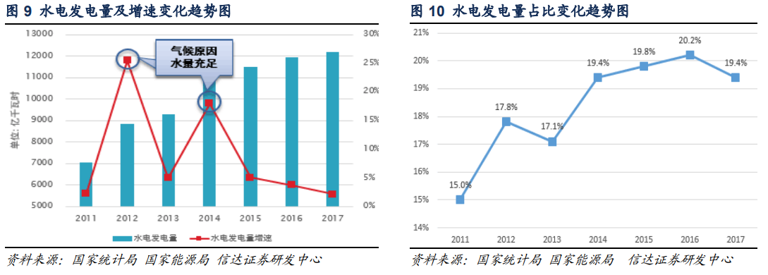 從發(fā)電量角度而言,2017 年水電發(fā)電量約為 12211 億千萬(wàn)時(shí),水電發(fā)電量增速由 2016 年的 3.8%降至 2.2%,水電發(fā)電量在全國(guó)全社會(huì)用電量中的占比也由 2016 年的 20.2%降至 2017 年的 19.4,這主要是因?yàn)樽罱鼉赡隁夂蛟驅(qū)е碌乃坎粔虺渥?,未?lái)我們預(yù)計(jì)水電發(fā)電量在全社會(huì)用電量中的占比將維持在 20%左右;近年來(lái),風(fēng)電裝機(jī)容量在發(fā)電設(shè)備裝機(jī)總量中的占比不斷提高,2017 年,風(fēng)電發(fā)電量約為 3057 億千瓦時(shí),約占全社會(huì)用電量的 4.8%,并網(wǎng)風(fēng)電裝機(jī)容量占比達(dá)到 9.2%,整體上呈現(xiàn)逐漸上升的趨勢(shì)。