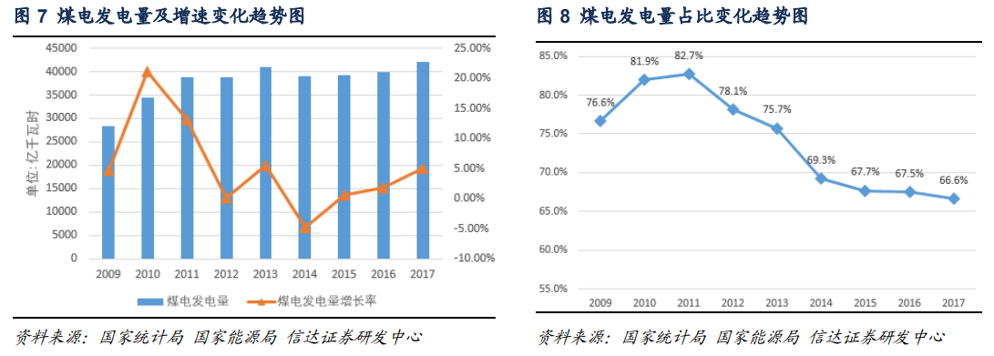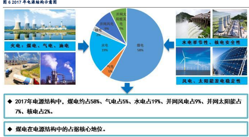 作為以煤為主的資源型國(guó)家,我國(guó)的發(fā)電能源也是以電煤為主。近年來(lái),發(fā)電裝機(jī)容量中 60%是煤電,發(fā)電量中約 70% 是煤電。一方面,按照目前的技術(shù)成熟度和成本優(yōu)勢(shì)來(lái)看,煤電是我國(guó)最穩(wěn)定的配套電源,我國(guó)煤電規(guī)模巨大,年均發(fā)電量在 40000 億千瓦時(shí)左右,據(jù)最新統(tǒng)計(jì)數(shù)據(jù)顯示,2017 年,煤電發(fā)電量約為 42000 億千瓦時(shí),在發(fā)電量中約占 66.7%,雖然比 2016 年發(fā)電量占比 67.5%略有回落,但煤電亦向高效清潔利用轉(zhuǎn)型,其他任何能源在今后相當(dāng)長(zhǎng)時(shí)間內(nèi)還不可能完全取代煤電在電源結(jié)構(gòu)中的核心地位;另一方面,近年來(lái)煤電發(fā)電量占比一直在降低,進(jìn)入“十三五”以來(lái),煤電發(fā)電量占比降速逐漸放緩,也就是說,為保障我國(guó)未來(lái)用電剛性需求,未來(lái)煤電將更多地承擔(dān)支撐電力系統(tǒng)運(yùn)行、給系統(tǒng)調(diào)峰等作用,但煤電仍是我國(guó)的主力電源,在電力系統(tǒng)中的主體地位不會(huì)發(fā)生變化。