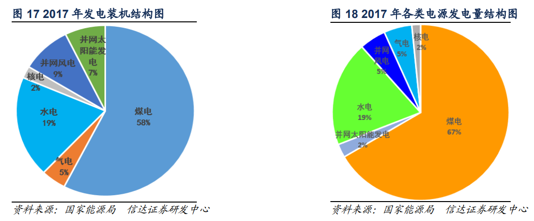 由此裝機(jī)結(jié)構(gòu)與發(fā)電結(jié)構(gòu)的對(duì)比可以發(fā)現(xiàn),煤電的實(shí)際發(fā)電占比要明顯高于煤電的裝機(jī)占比,這說明煤電的實(shí)際市場(chǎng)占有率更高一些,也表明我國(guó)風(fēng)電、太陽(yáng)能光伏發(fā)電的利用率低于裝機(jī)容量,也就是說棄風(fēng)、棄光現(xiàn)象較為明顯。