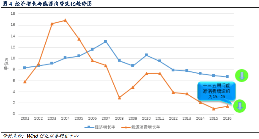 新常態(tài)下,能源消費(fèi)增速顯著降低,2018 年隨著產(chǎn)能出清的到來(lái),步入能源新周期后的煤炭消費(fèi)占比將會(huì)更低,能源消費(fèi)增速仍將繼續(xù)降低,我們預(yù)計(jì)“十三五”中國(guó)能源消費(fèi)增速將在 1%~2%之間浮動(dòng)。
