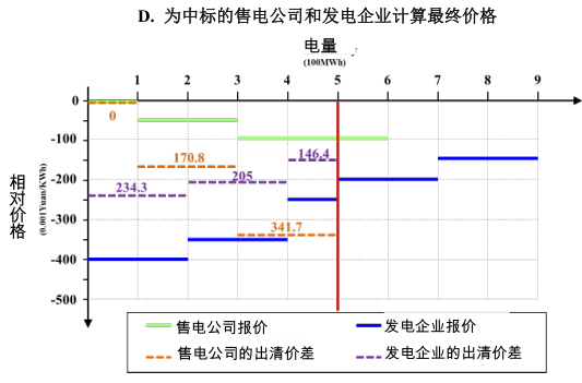 在圖 C 中,系統(tǒng)的價差電費總額被對半分配給中標的售電公司和發(fā)電企業(yè),然后,每個售電公司或發(fā)電企業(yè)再分別根據(jù)他們在總消費者剩余或總生產者剩余中的份額得到相應的價差電費。例如,在中標的售電公司當中報價第二低的那個公司的消費者剩余是 100,這等于總消費者剩余的 1/3 (= 100/300),所以該公司分配到的價差電費是 1025的 1/3 ,即 341.6。