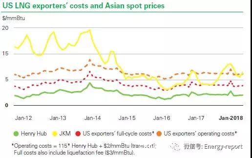 用日韓指標代表亞洲LNG現(xiàn)貨價格,該指標在過去的幾年中在美國出口全周期成本和它們的短期運營成本之間震蕩。美國LNG的出口商更愿意按照能覆蓋其運營成本的時間供應(yīng)LNG,即使短期運營成本低于他們的全周期成本。