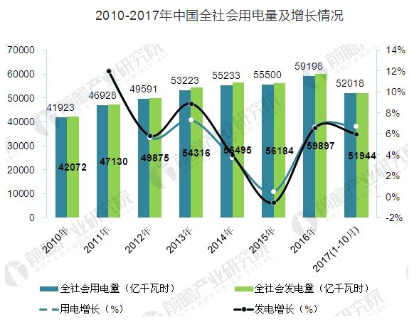 根據(jù)前瞻產(chǎn)業(yè)研究院統(tǒng)計(jì),2016年,全社會(huì)用電量59198億千瓦時(shí),同比增長5 0%。2017年1-10月份,全國電力供需總體寬松。1-10月份,全國全社