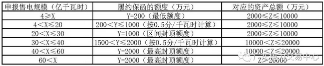 根據(jù)售電規(guī)模與履約保函額度的計算規(guī)則,以及售電規(guī)模與資產(chǎn)總額的匹配關(guān)系,即可得出售電規(guī)模(X)、履約保函額度(Y)與資產(chǎn)總額(Z)的對應(yīng)表如下: