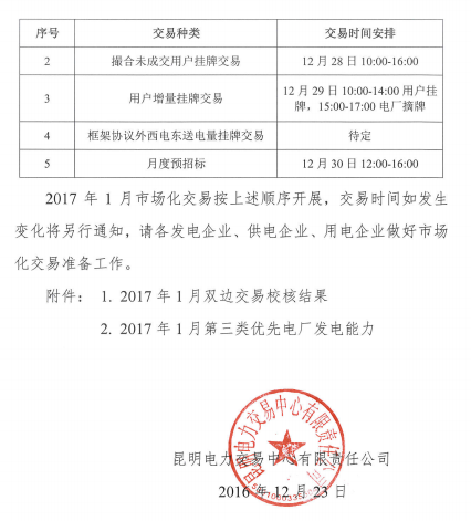 昆明電力交易中心:2017年01月電力市場化交易信息披露