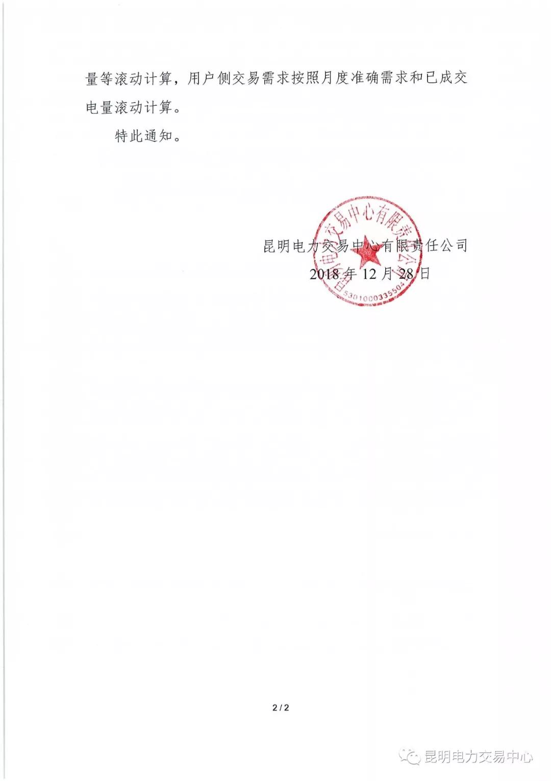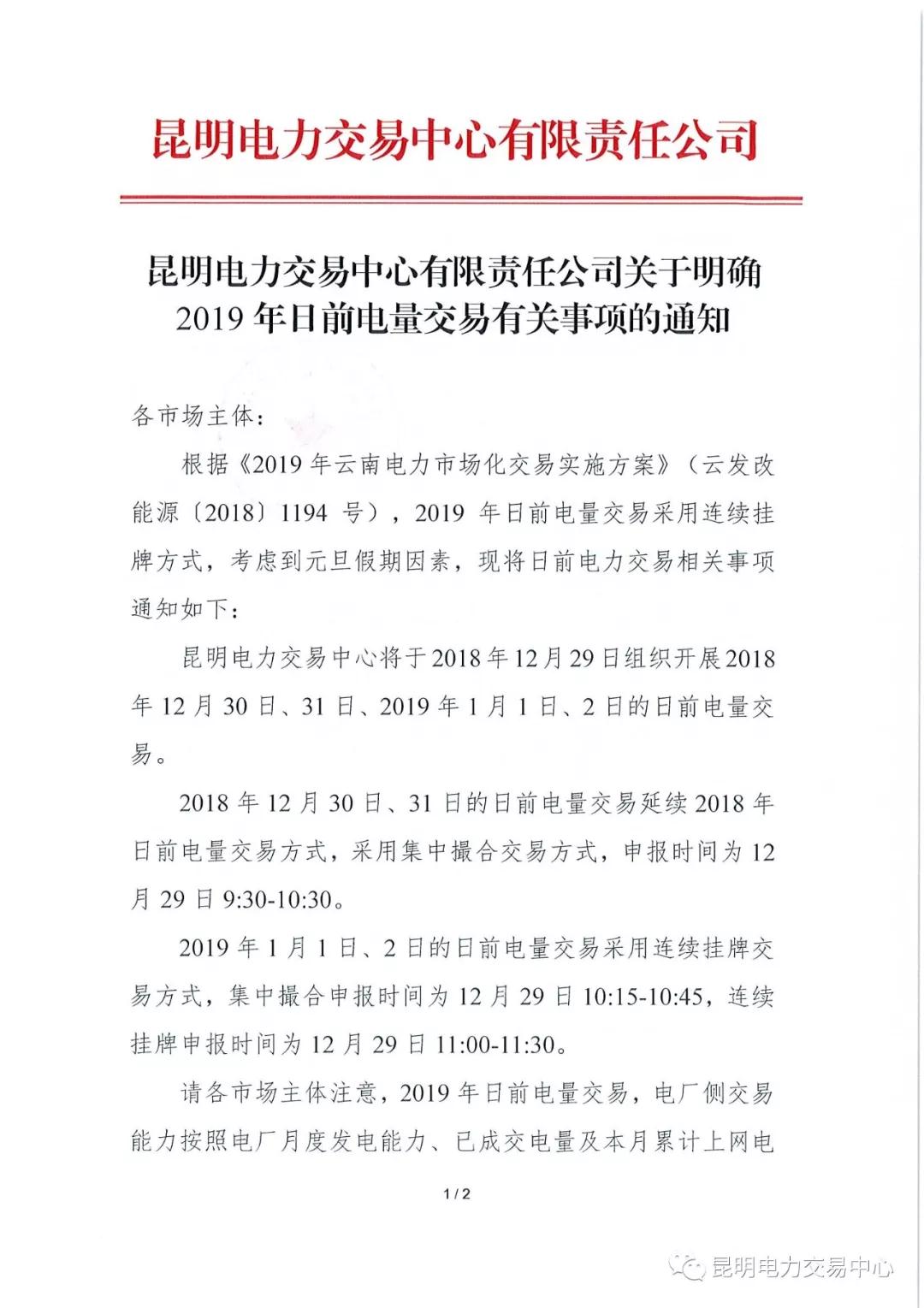 昆明電力交易中心日前發(fā)布了《關(guān)于明確2019年日前電量交易有關(guān)事項(xiàng)的通知》,2019年1月1日、2日的日前電量交易采用連續(xù)掛牌交易方式。