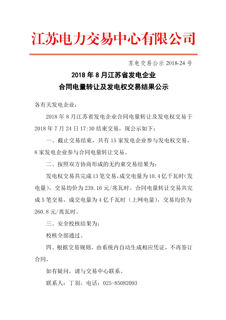 江蘇2018年8月發(fā)電企業(yè)合同電量轉(zhuǎn)讓及發(fā)電權交易結(jié)果