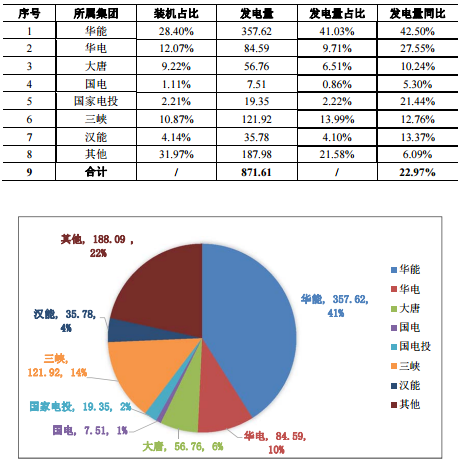 按所屬集團(tuán)來看,2017 年上半年,云南統(tǒng)調(diào)水電發(fā)電量中,華能發(fā)電量 357.62 億千瓦時(shí),同比增加 42.5%,占比 41.03%;華電發(fā)電量 84.59 億千瓦時(shí),同比增加 27.55%,占比 9.71%;大唐發(fā)電量56.76 億千瓦時(shí),同比增加 10.24%,占比 6.51%;國電發(fā)電量 7.51 億千瓦時(shí),同比增加 5.3%,占比 0.86%;國家電投發(fā)電量 19.35 億千瓦時(shí),同比增加 21.44%,占比 2.22%;三峽發(fā)電量 121.92 億千瓦時(shí),同比增加 12.76%,占比 13.99%;漢能發(fā)電量 35.78 億千瓦時(shí),同比增加 13.37%,占比 4.1%;其他集團(tuán)合計(jì)發(fā)電量 187.98 億千瓦時(shí),同比增加 6.09%,占比 21.58%。