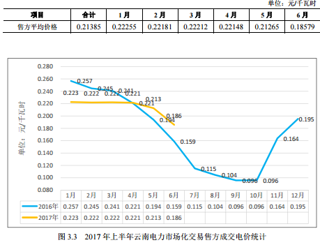 受益于市場結(jié)構(gòu)和市場體系的更趨完善,再加上上半年西電東送大幅增送有力緩解了供需矛盾,2017 年上半年云南電力市場化交易成交價格整體平穩(wěn),售方平均成交價每千瓦時 0.214 元。在 1 至 4 月的枯期,售方平均成交價在每千瓦時 0.222 元左右;進(jìn)入 5 月,部分水電廠入庫流量持續(xù)增大,電力供應(yīng)能力有所增強(qiáng),全月售方平均成交價每千瓦時 0.213 元;進(jìn)入 6 月,隨著汛期的到來,水電發(fā)電能力大幅增加,部分調(diào)節(jié)能力差的電廠棄水壓力增大,市場價格環(huán)比繼續(xù)下降,全月售方平均成交價每千瓦時 0.186 元。