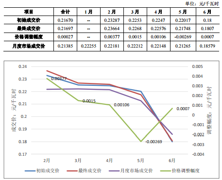 雖然月度集中撮合交易市場占比明顯下降,但是月度集中撮合交易作為發(fā)現(xiàn)市場價格信號的作用進一步突顯,其平均成交價與月度市場化交易平均成交價走勢高度一致,主要體現(xiàn)在:(1)雙邊交易中,集中撮合成交電量 市場化成交電量 集中撮合交易電量占比很多市場主體以集中撮合交易平均成交價為“標(biāo)桿”,按照約定的浮動機制來確定雙邊交易電量的最終成交價;(2)自主掛牌交易中,市場主體通常將集中撮合交易平均成交價作為摘牌的“底線”;(3)售電公司的價格保底服務(wù)模式中,通常將用戶成交價低于集中撮合交易平均成交價作為收費的前提條件;(4)在偏差處理機制中,將售方集中撮合交易平均成交價作為上調(diào)服務(wù)價格的上限。2017 年上半年,月度集中撮合交易售方平均成交價每千瓦時 0.23569 元,在枯平期的 1 至 5 月價格比較平穩(wěn),6 月份集中撮合交易平均成交價環(huán)比有所下降,為每千瓦時 0.20916 元。