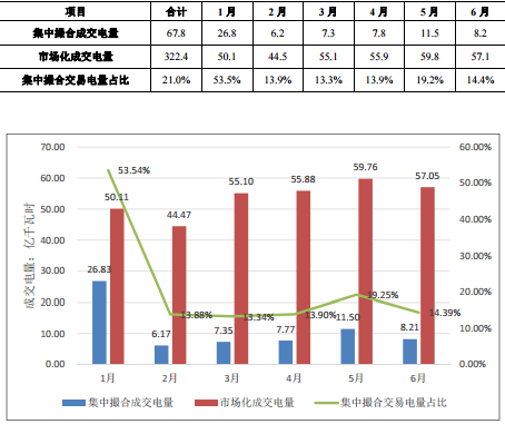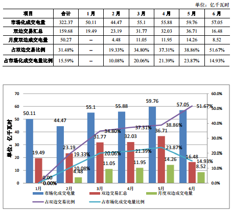 2017 年上半年,昆明電力交易中心按月組織開展了集中撮合交易,共有逾 3200 戶用戶參與申報,累計申報電量 131.55 億千瓦時;售方累計申報電量 350.38 億千瓦時;上半年集中撮合交易累計成交電量 67.83 億千瓦時,占省內(nèi)市場化成交電量的 21.04%。