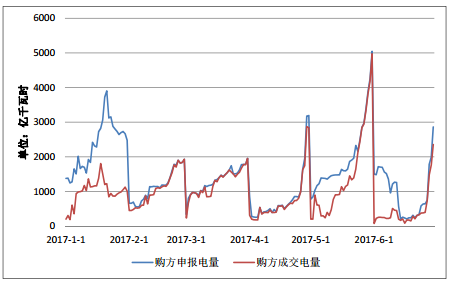 圖 3.17 2017 年上半年日前電量交易申報電量、成交電量對比