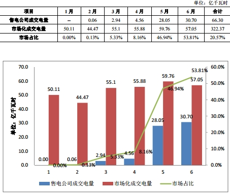 3.2.5 售電公司交易情況2017 年 1 月 18 日,《云南省售電側(cè)改革實施方案》正式印發(fā)后,昆明電力交易中心快速響應(yīng)、優(yōu)質(zhì)服務(wù),全力支持培育售電公司,于1 月 19 日啟動售電公司“一注冊、一承諾、一公示、三備案”程序,同時開發(fā)完善電力交易系統(tǒng)相關(guān)功能模塊,確保售電公司盡快完成準(zhǔn)入程序參與交易。第一批 10 家售電公司于 2 月 19 日完成準(zhǔn)入程序,并與 433 家電力用戶完成委托服務(wù)授權(quán),開始參與日前電量交易。2017 年上半年,共 50 家售電公司完成市場準(zhǔn)入程序,繳納了保證金的售電公司共有 22 家,共完成電力用戶委托服務(wù)授權(quán) 2055 戶,售電公司每月成交電量穩(wěn)步上升,特別是自 5 月云南慧能售電股份有限公司開始為冶金集團旗下電力用戶提供交易服務(wù)以來,售電公司當(dāng)月成交電量達(dá)到 28.05 億千瓦時,6 月份售電公司成交電量達(dá)到 30.7億千瓦時,市場占比首次過半,達(dá)到了 53.81%。