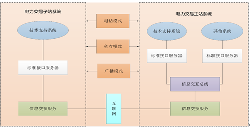 電力交易主站系統(tǒng)與電力交易子站系統(tǒng)之間的信息交換體系由信息交換總線、數(shù)據(jù)傳輸總線、標(biāo)準(zhǔn)接口服務(wù)器、隔離裝置以及參與信息交互的其他系統(tǒng)共同組成,其具體交互運(yùn)行關(guān)系如圖: