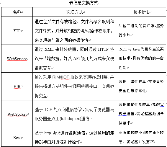 FTP協(xié)議交換的信息為公開共享信息,信息交換的方向為單向,實(shí)現(xiàn)簡單、傳輸批量數(shù)據(jù)效率較高;WebService遵守具體的技術(shù)規(guī)范,能與其它兼容的組件進(jìn)行互操作,若增加數(shù)據(jù)量則會降低解釋程序的執(zhí)行效率;EJB基于規(guī)范的平臺,支持多種中間件技術(shù),對資源配置要求較高;WebSocket使用客戶/服務(wù)器模式,實(shí)現(xiàn)簡單、性能高,一旦連接上之后,就可以按設(shè)計的數(shù)據(jù)交換方法和格式進(jìn)行數(shù)據(jù)傳輸,適合大批量數(shù)據(jù)傳輸;Rest基于HTTP協(xié)議,可利用緩存來提高響應(yīng)速度,對資源依賴性較小,適合高并發(fā)傳輸訪問。