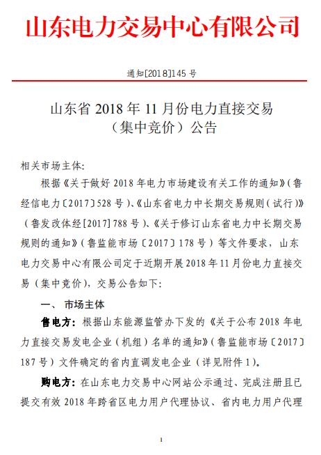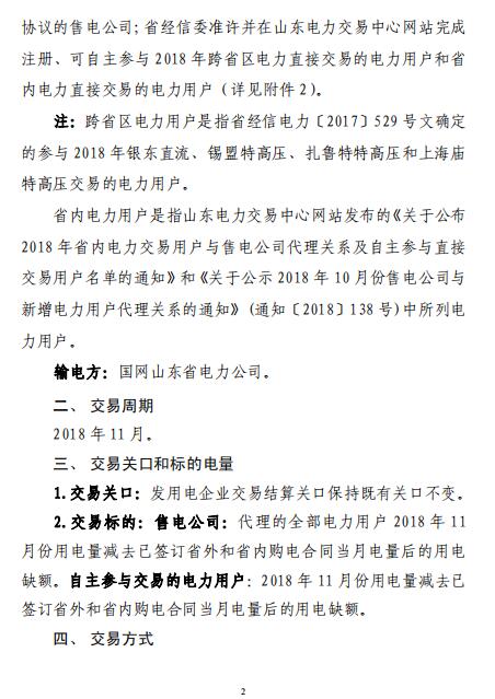 山東2018年11月電力直接交易 (集中競價):發(fā)用電企業(yè)交易結(jié)算關(guān)口保持既有關(guān)口不變