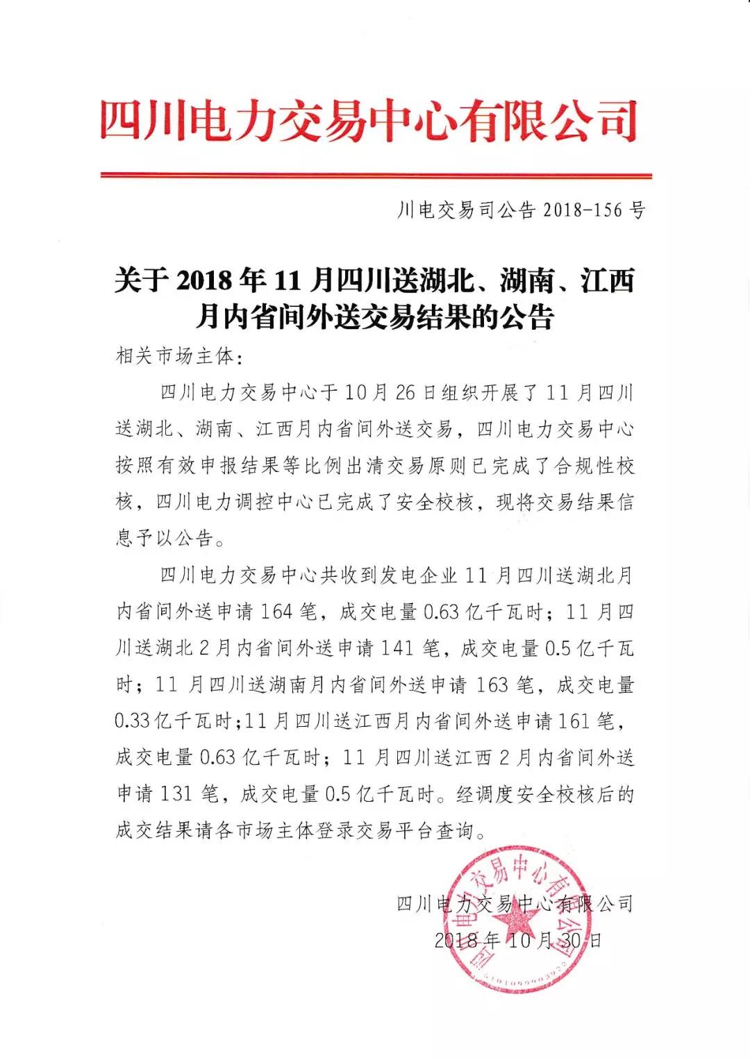 公告 | 關(guān)于2018年11月四川送湖北、湖南、江西月內(nèi)省間外送交易結(jié)果的公告