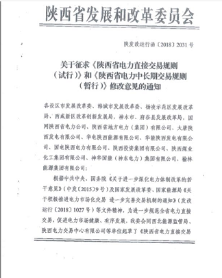 陜西省發(fā)改委日前發(fā)布了關(guān)于征求《陜西省電力直接交易規(guī)則(試行)》和《陜西省電力中長期交易規(guī)則(暫行)》修改意見的通知。