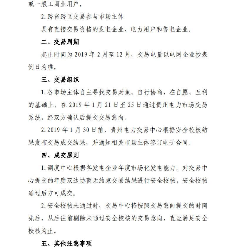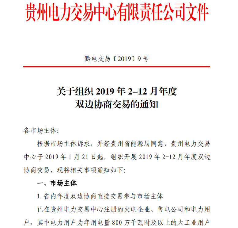 貴州電力交易中心發(fā)布了《關(guān)于組織 2019 年2-12月年度雙邊協(xié)商交易的通知》