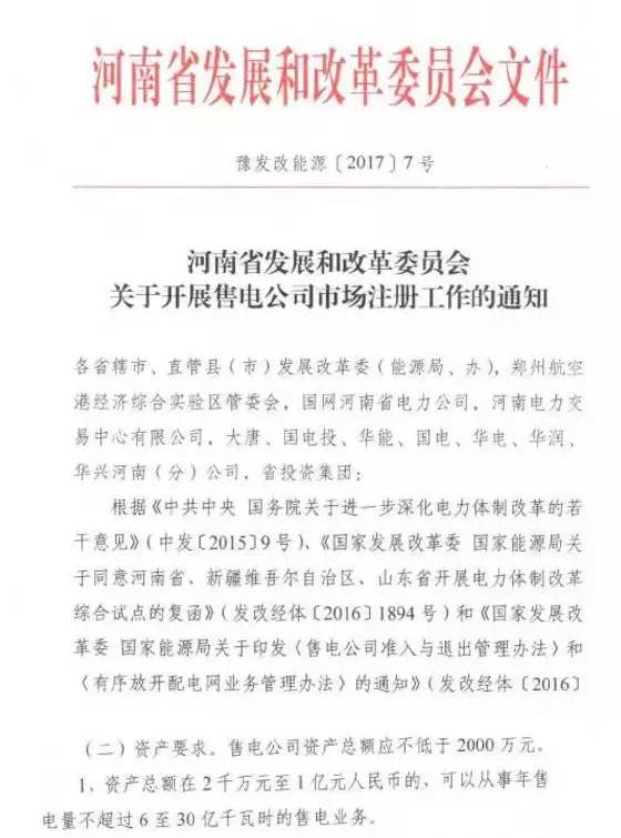 關(guān)于展開售電公司市場(chǎng)注冊(cè)工作的通知,明確了河南注冊(cè)主體的資產(chǎn)要求、工作人員、辦公要求、注冊(cè)流程及資料等,要多途徑培育售電公司。