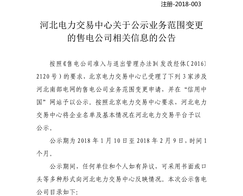 《河北電力交易中心關(guān)于公示業(yè)務(wù)范圍變更的售電公司相關(guān)信息的公告》(注冊(cè)-2018-003)
