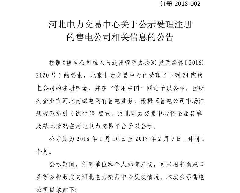 《河北電力交易中心關(guān)于公示受理注冊(cè)的售電公司相關(guān)信息的公告》(注冊(cè)-2018-002)