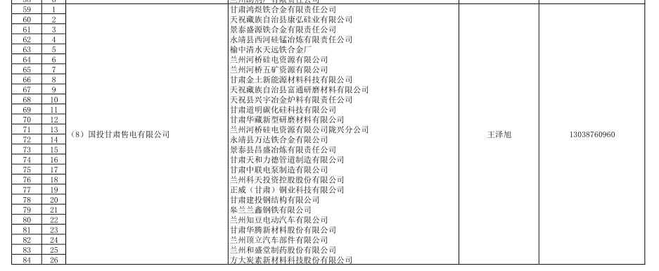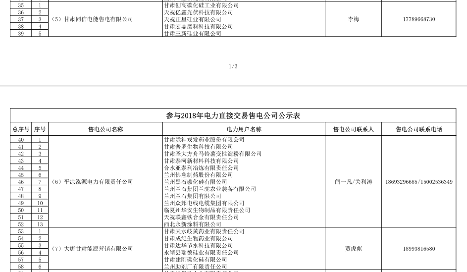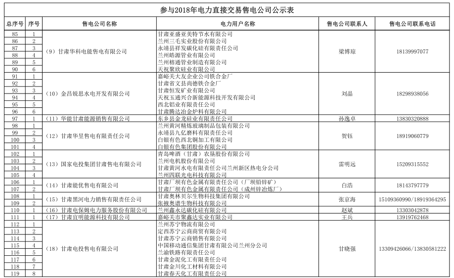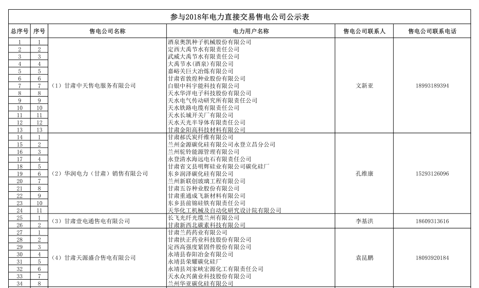 甘肅2018年電力直接交易的18家售電公司和119家電力用戶名單