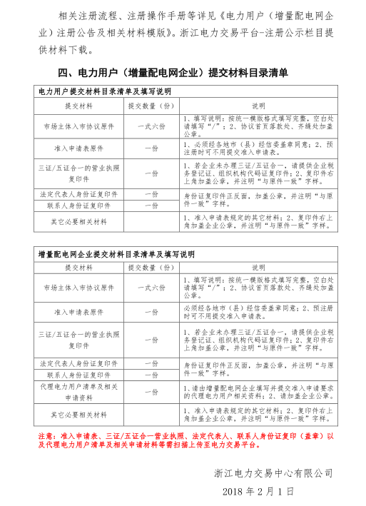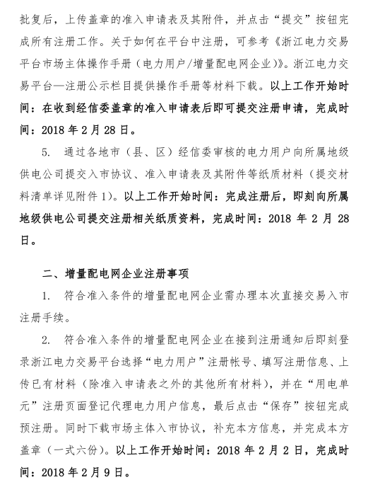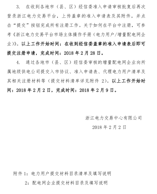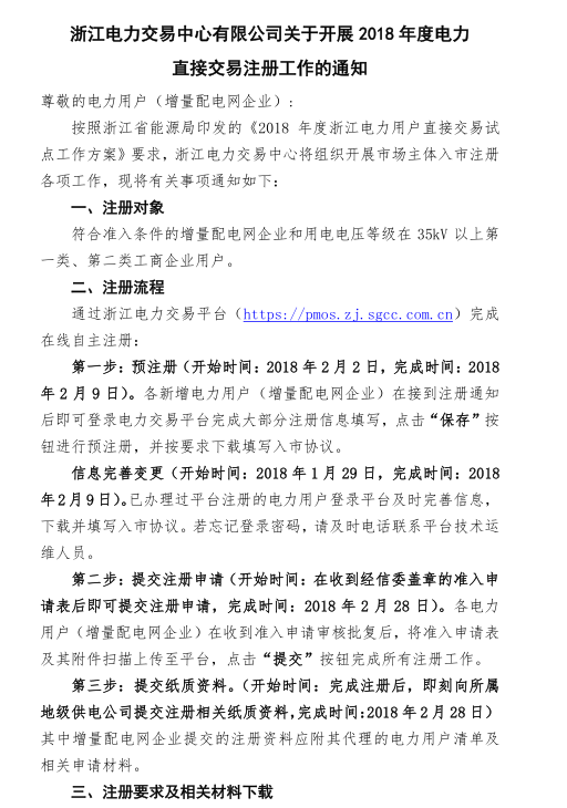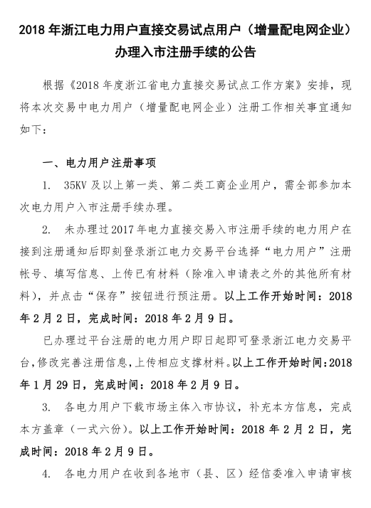此外,浙江電力交易中心還發(fā)布了《2018年浙江電力用戶直接交易試點用戶(增量配電網(wǎng)企業(yè))辦理入市注冊手續(xù)的公告》,35KV及以上第一類、第二類工商企業(yè)用戶,需全部參加本次電力用戶入市注冊手續(xù)辦理。