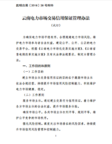 隨著電力市場建設的不斷推進,云南電力市場活躍度不斷提升,為強化市場風險防范能力,確保電力市場平穩(wěn)有序,合理規(guī)避風險,維護電力市場參與者合法權益,強化公平、公開、公正的電力市場運營能力,更好的為電力市場建設和市場主體服務。根據《云南電力市場化交易方案》、《云南省售電側改革實施方案》及有關法律法規(guī)要求,昆明電力交易中心制定了《云南電力市場交易信用保證管理辦法》。