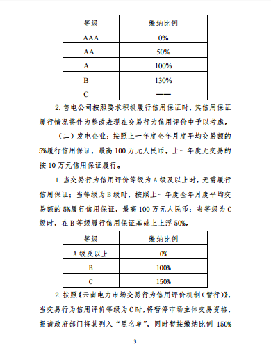 三是保證額度與交易行為信用評價掛鉤。信用保證履行要求和保證額度與云南電力市場主體交易行為信用評價結果聯動,實現基于基準繳納等級,隨等級上升下調所需保證額度、等級下降則上調所需保證額度。