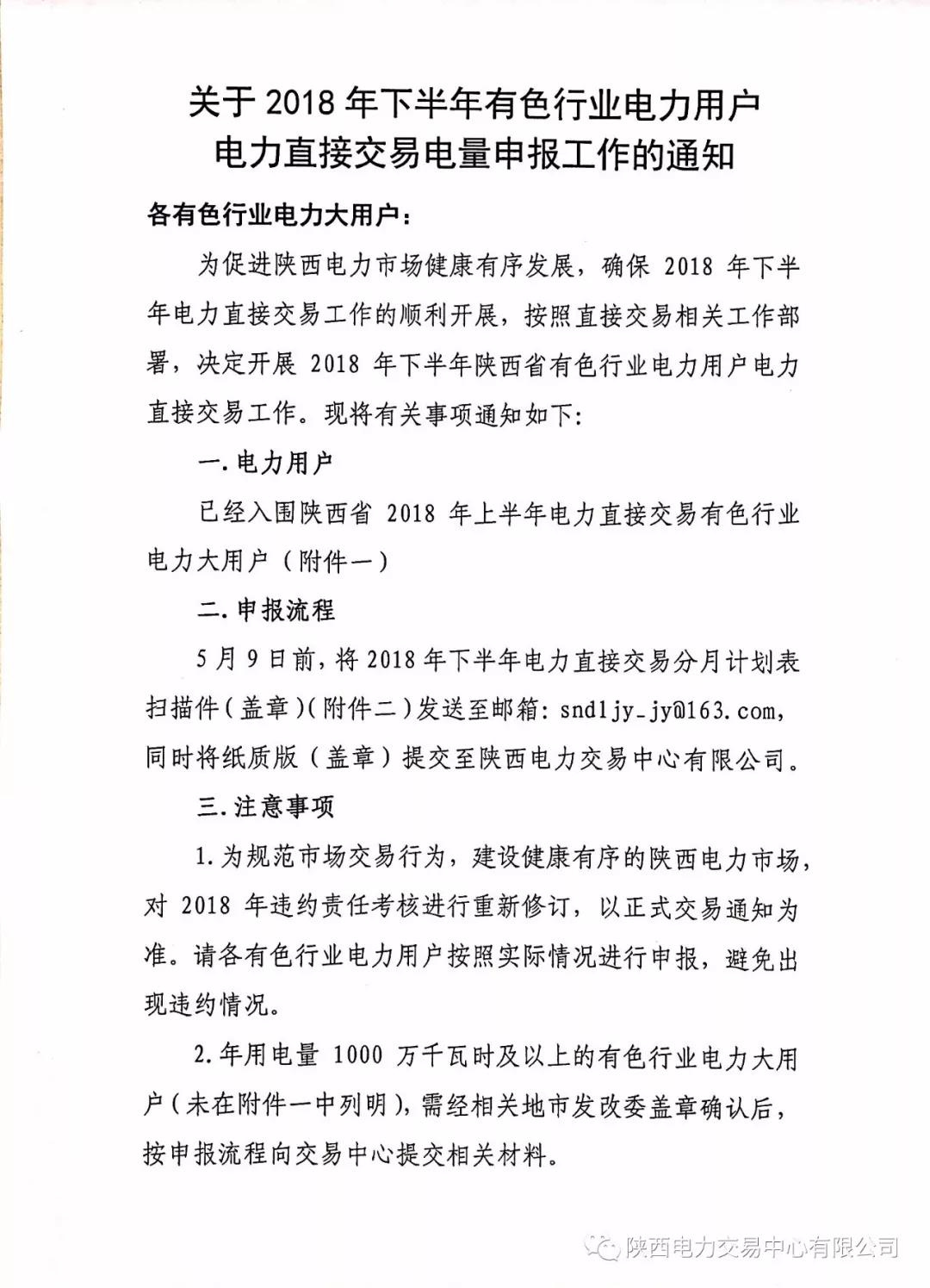 陜西2018年下半年有色行業(yè)電力用戶電力直接交易電量開始申報(bào)
