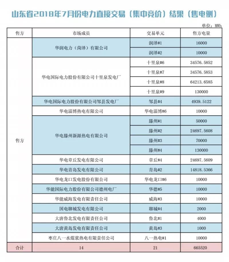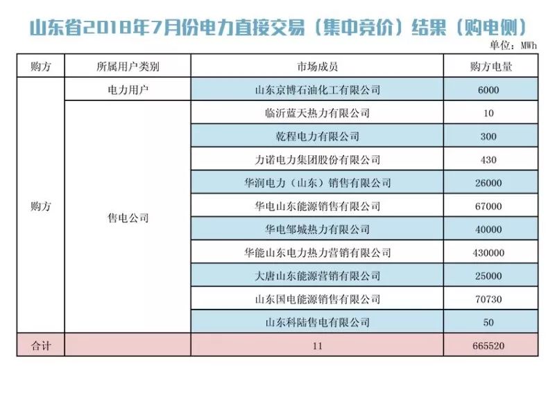 山東2018年7月份電力直接交易(集中競價) 交易電量66萬兆瓦時