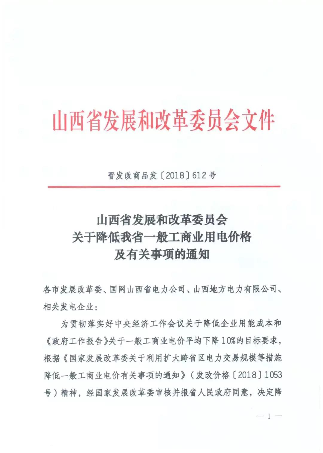 山西省發(fā)改委發(fā)布《關(guān)于降低我省一般工商業(yè)用電價格及有關(guān)事項的通知》