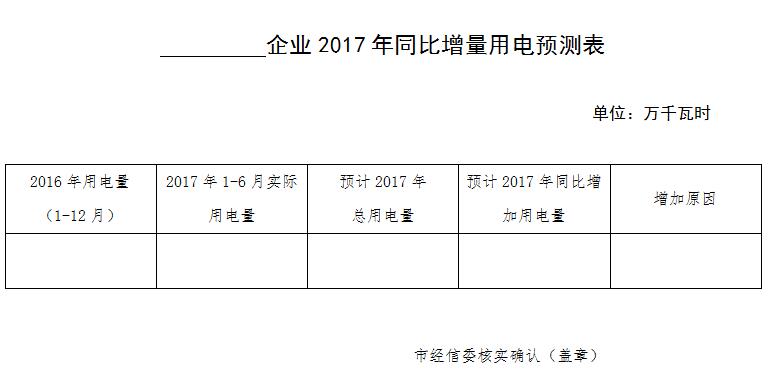 五、各縣(市、區(qū))經(jīng)信局要認(rèn)真組織企業(yè),根據(jù)年內(nèi)生產(chǎn)安排和項(xiàng)目投運(yùn)情況,實(shí)事求是地做好年度用電預(yù)測工作,并組織符合條件的企業(yè)填寫年度增量用電預(yù)測表,務(wù)于7月11日前將屬地內(nèi)電力用戶增量用電情況以正式文件報(bào)市經(jīng)信委。