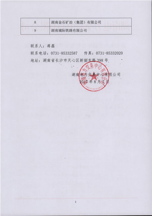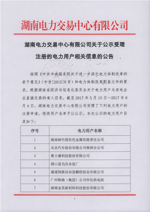 按照《中共中央國務(wù)院關(guān)于進(jìn)一步深化電力體制改革的若干意見》(中發(fā)[2015]9號)和電力體制改革配套文件的要求,根據(jù)湖南省經(jīng)濟(jì)與信息化委員會關(guān)于電力用戶與發(fā)電企業(yè)直接交易的準(zhǔn)入目錄,截至2017年5月15日—2017年8月7日,湖南電力交易中心有限公司受理了下列電力用戶的注冊申請,現(xiàn)將用戶名單予以公示,本次公示的電力用戶目錄詳見附件。