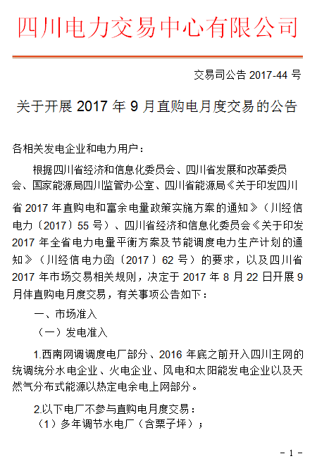 從四川電力交易中心獲悉,四川電力交易中心日前發(fā)布了關(guān)于開展2017年9月直購(gòu)電月度交易的公告。決定于2017年8 月22 日開展9月份直購(gòu)電月度交易。交易過(guò)程劃分為集中競(jìng)價(jià)、雙掛雙摘、火電匹配三個(gè)階段,交易過(guò)程