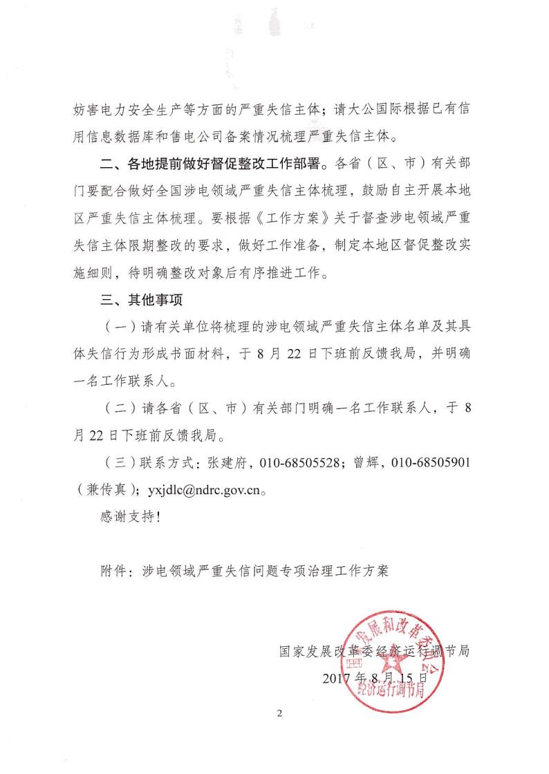 為開展涉電領域嚴重失信問題專項治理工作,現(xiàn)將國家發(fā)改委《關于梳理報送涉電領域嚴重失信主體名單的通知》轉(zhuǎn)發(fā)你們,請認真貫徹執(zhí)行,并提出以下要求。