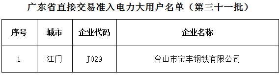 廣東省經(jīng)信委日前下發(fā)了《第三十一批直接交易準(zhǔn)入電力大用戶名單》,原屬落后產(chǎn)能的臺(tái)山市寶豐鋼鐵有限公司完成相關(guān)整改,符合與發(fā)電企業(yè)直接交易擴(kuò)大試點(diǎn)準(zhǔn)入條件,列入第三十一批直接交易準(zhǔn)入電力大用戶名單。詳情如下: